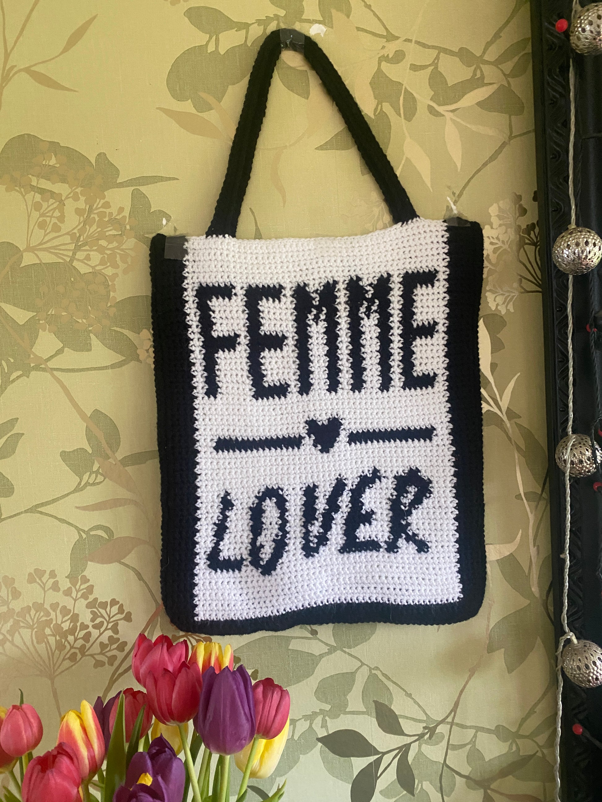 Each bag is lovingly by a lesbian, lined with fabric and fastening with a snap clasp. Enjoy :)